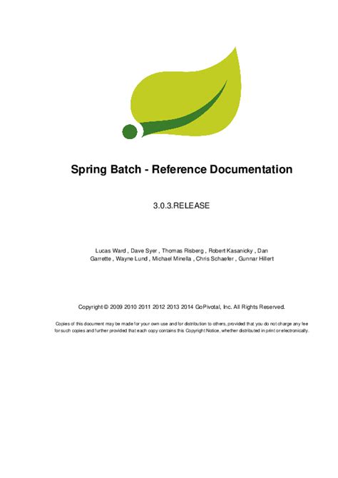 Read Online spring batch reference documentation PDF online is a convenient and frugal way to read spring batch reference documentation you love right from the comfort of your own home. Yes, there sites where you can get PDF "for free" but the ones listed below are clean from viruses and completely legal to use.